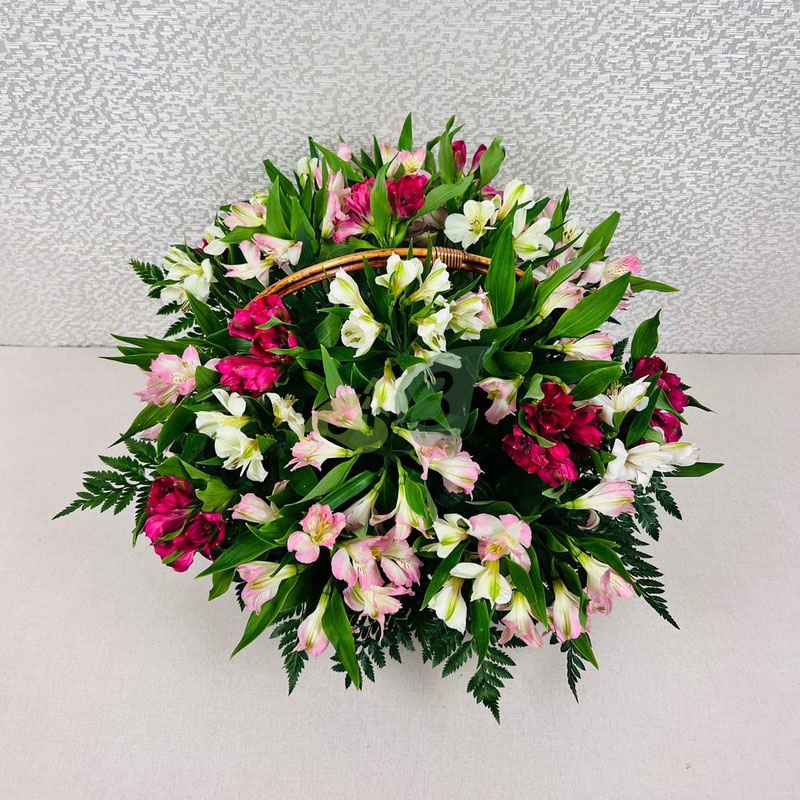 Мы собрали альстромерии самых ярких оттенков в одной композиции в корзине для того, чтобы вы могли преподнести роскошные цветы (и недорогие к тому же) в подарок.